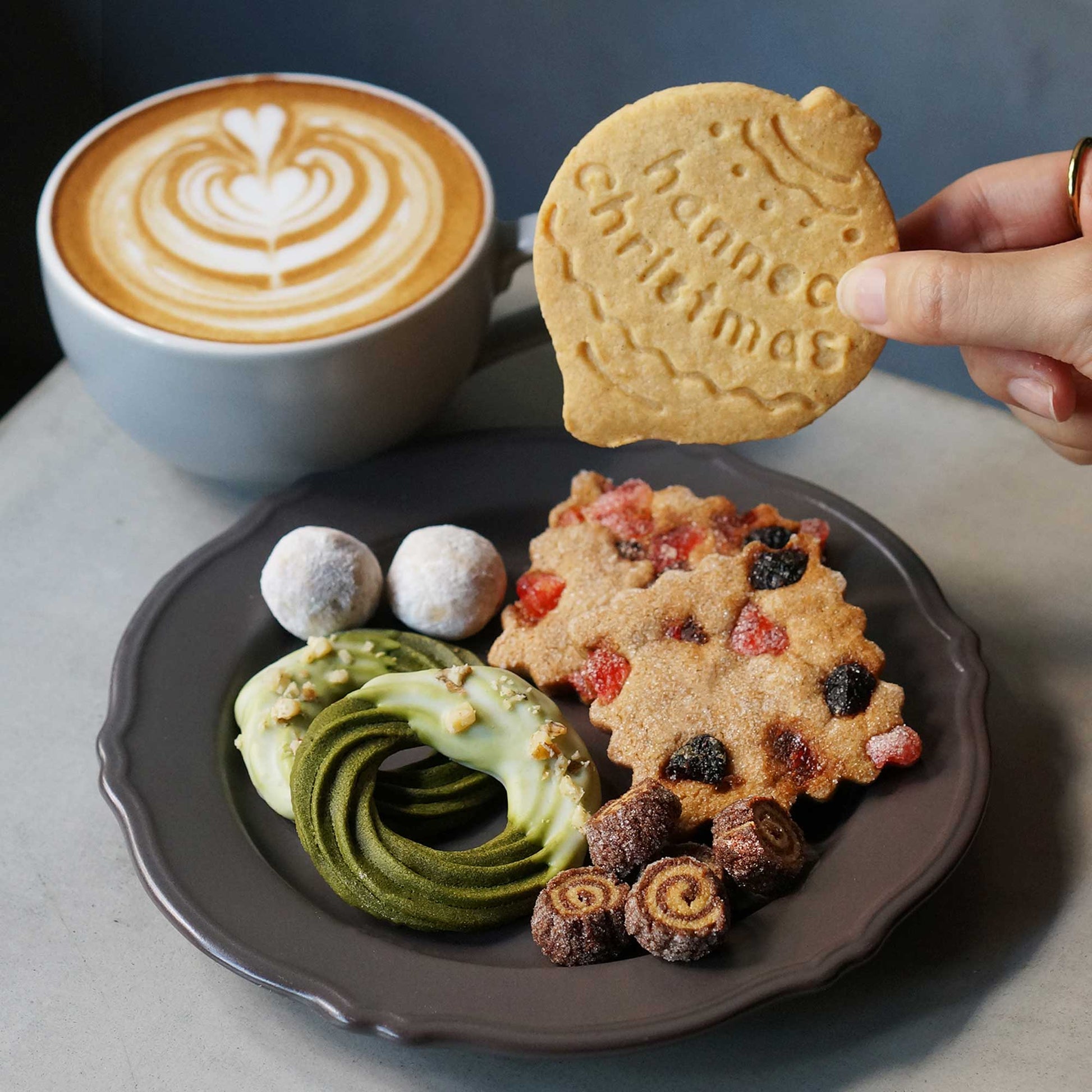 甘いバニラの香りをほんのり効かせた、濃厚な抹茶クッキー。半分にはホワイトチョコをコーティングし、胡桃を散りばめて、リースのように仕上げました。