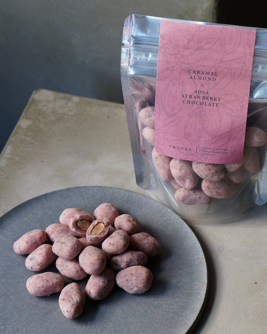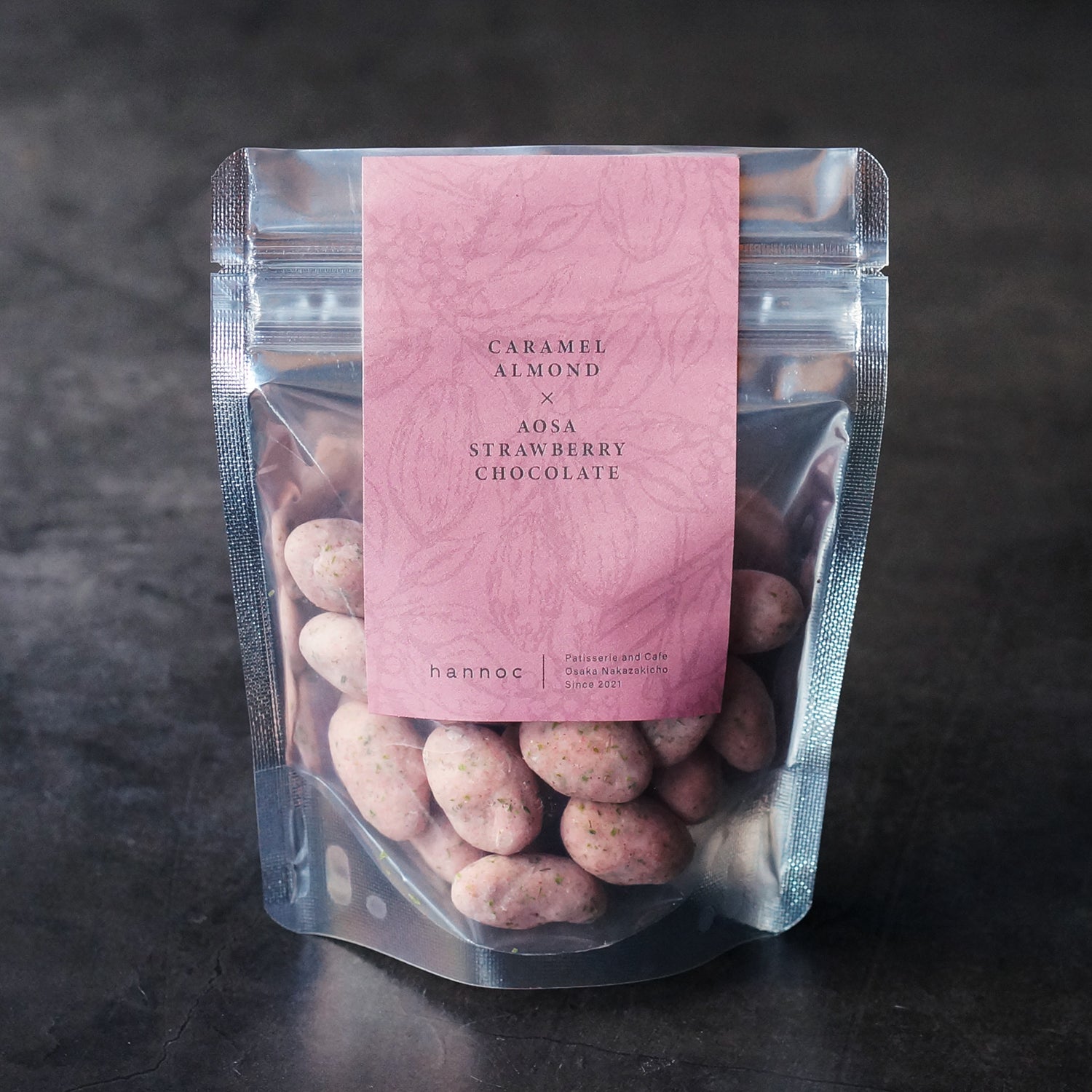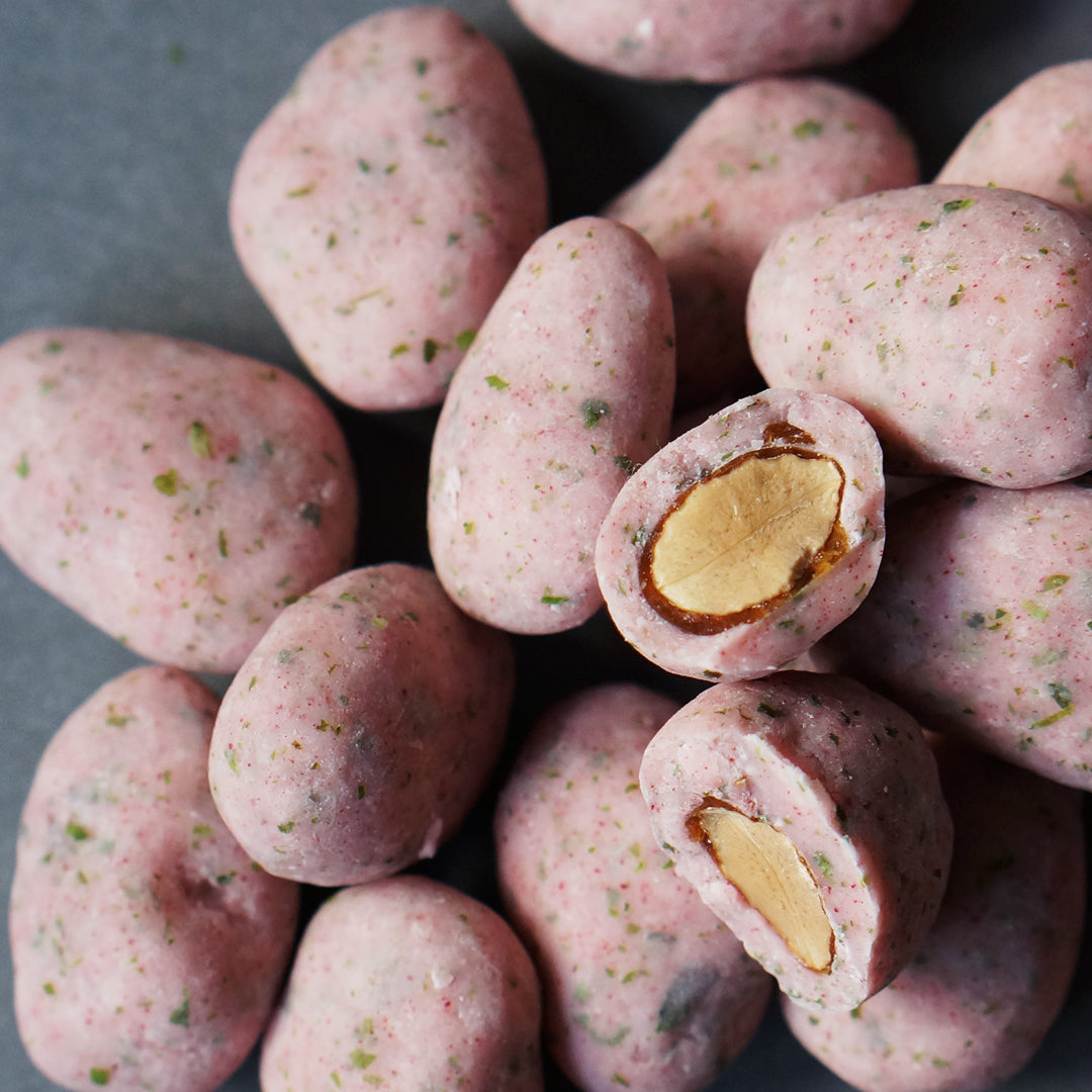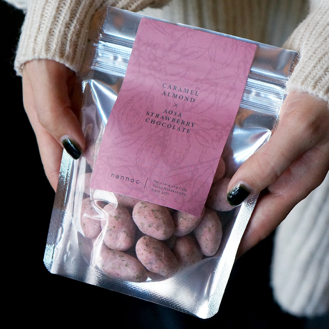 香ばしくキャラメリゼしたローストアーモンドを、たっぷりの苺パウダーと少量のあおさ&ゲランド塩を練り込んだホワイトチョコレートで厚めにコーティング。口の中に苺の甘酸っぱさが広がると同時に、あおさの海藻特有の爽やかな香りがふんわりと鼻に抜けていきます。