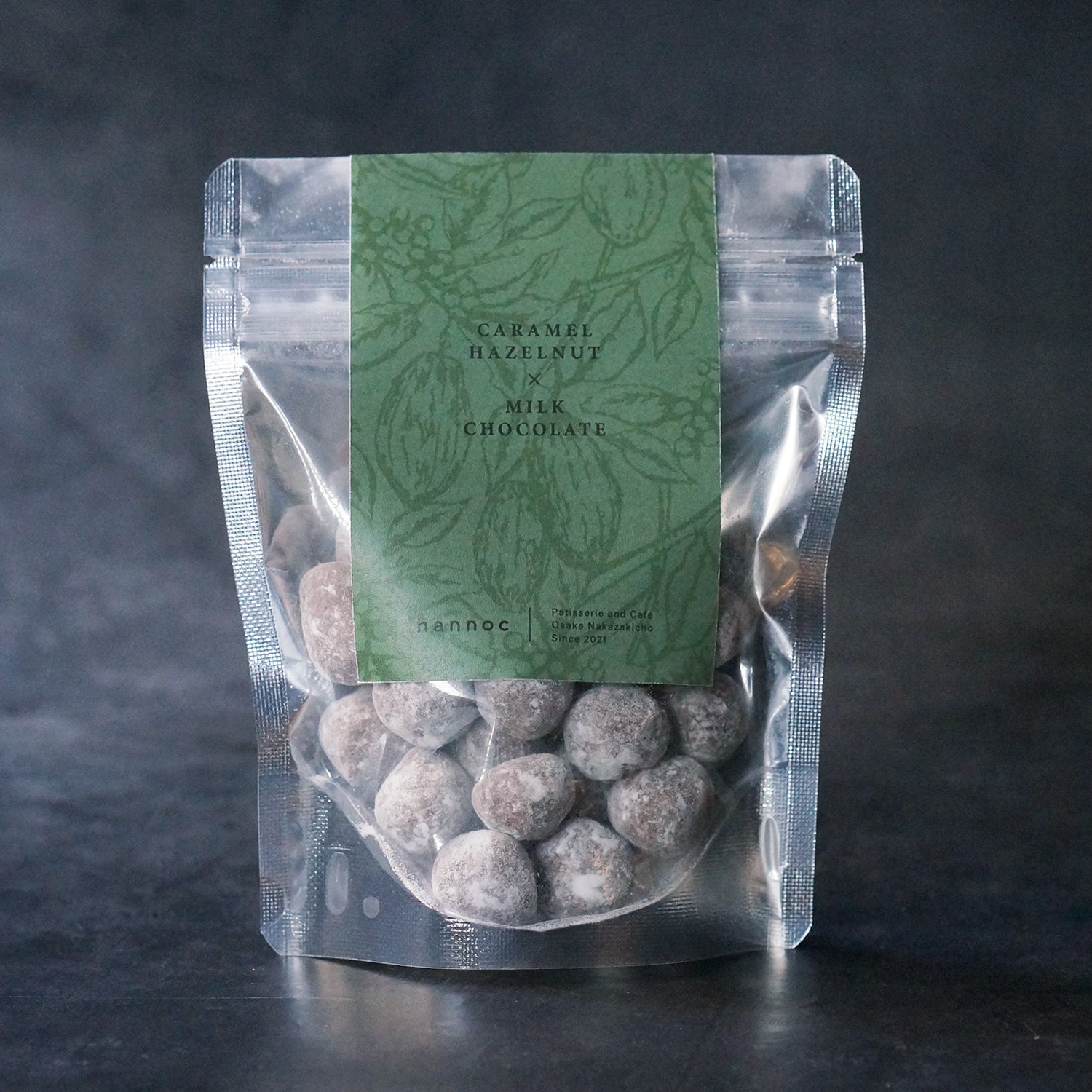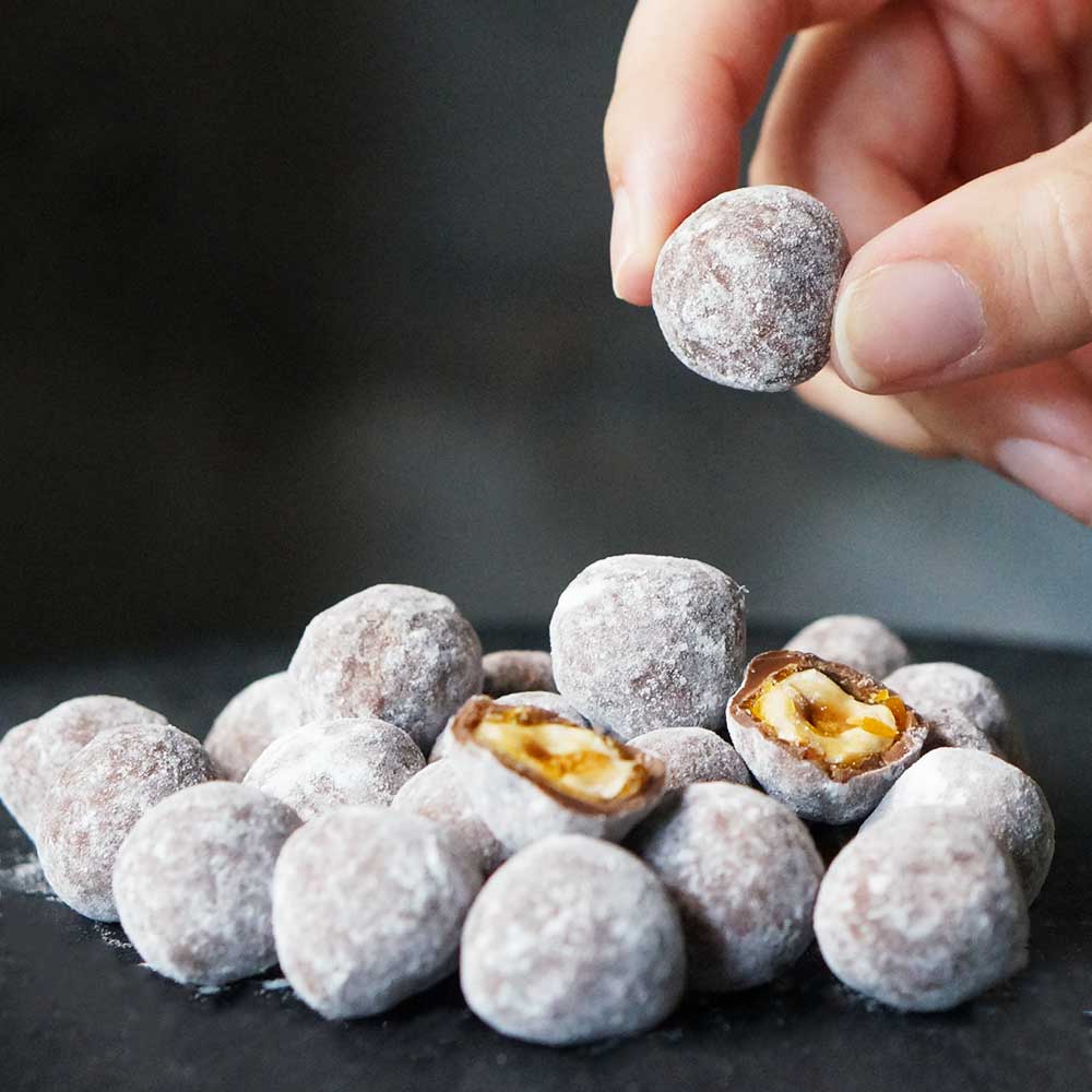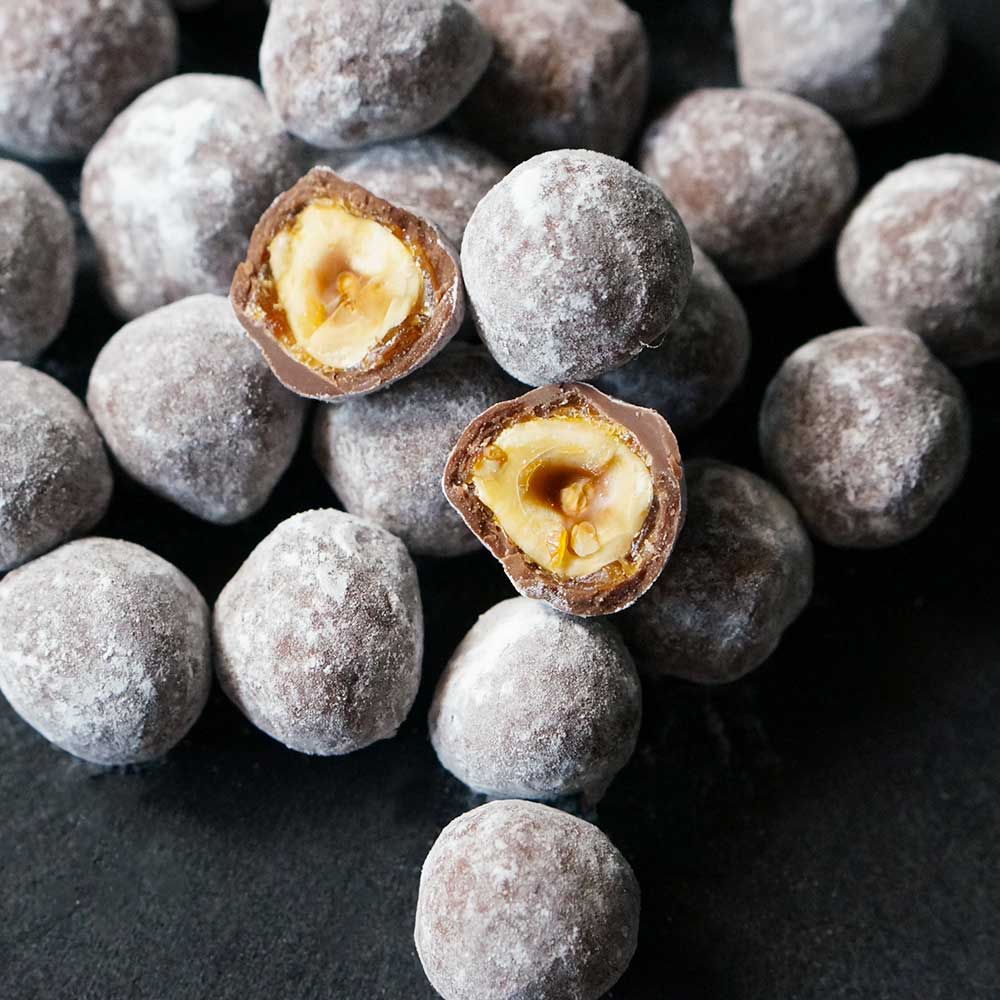 香ばしくキャラメリゼされたヘーゼルナッツを、上質なミルクチョコレートでコーティングした、贅沢な一粒です。キャラメルの濃厚な甘さとナッツの香ばしさ、そしてミルクチョコレートのまろやかな味わいが絶妙に調和。ザクザク、シャリっとした歯切れの良い食感がクセになります。