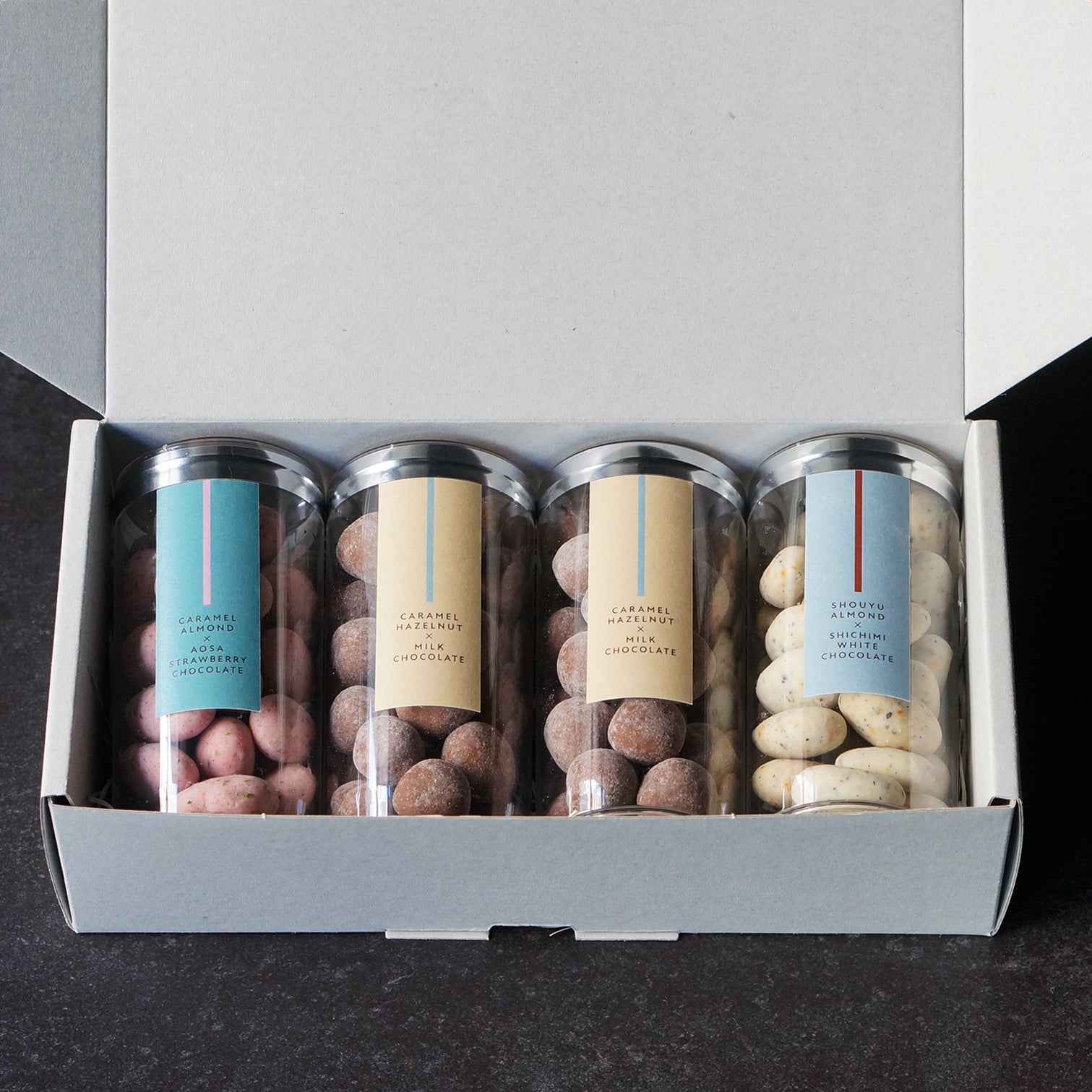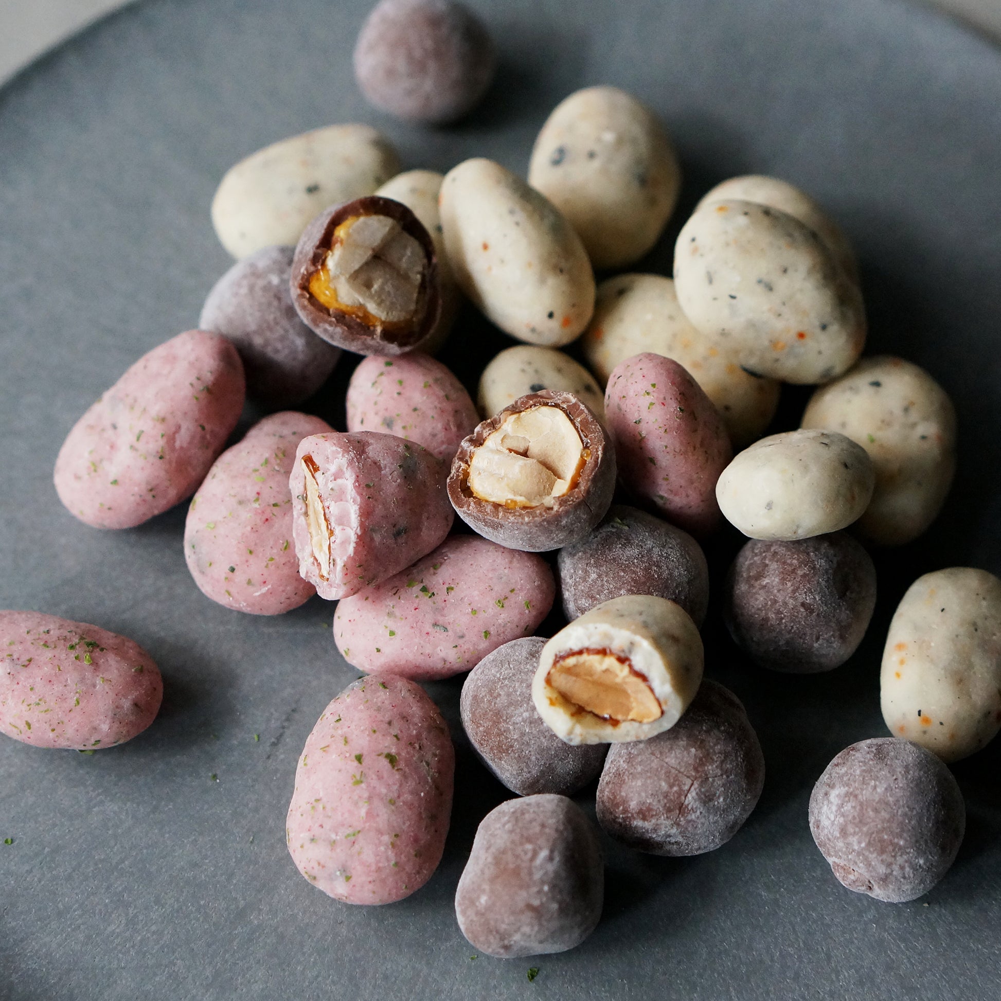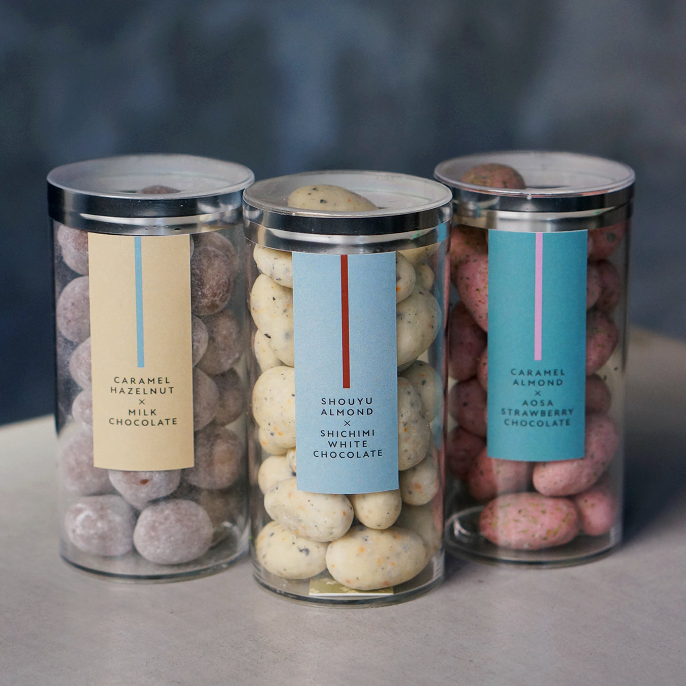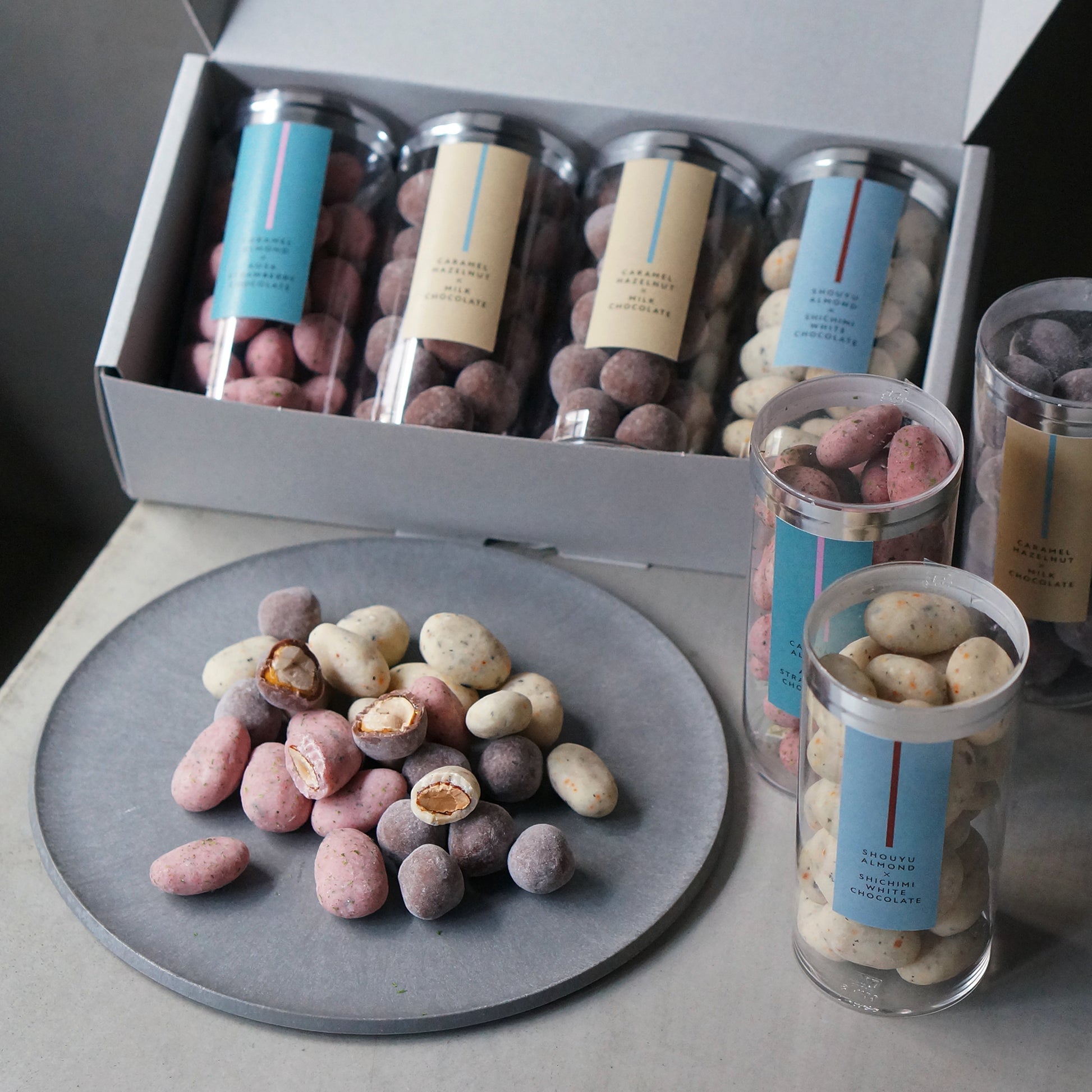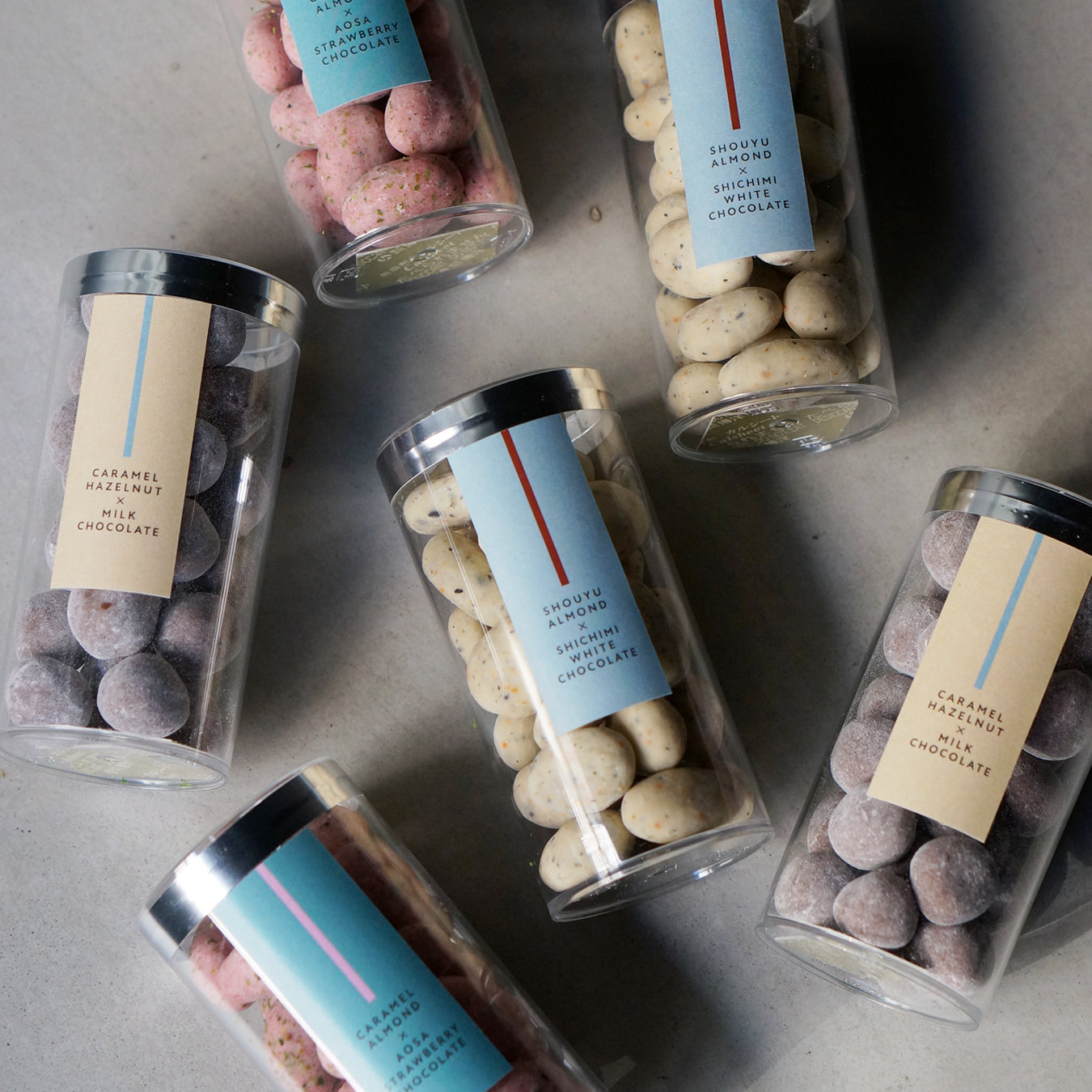 醤油の香ばしい味わいをまったアーモンドキャラメリゼを、七味唐辛子とすりごまを練り込んだホワイトチョコレートで包みました。 ホワイトチョコのまろやかさの中に、ピリッとした刺激と複雑な旨味がじんわりと広がり、ひと粒食べるとクセになる味わい。