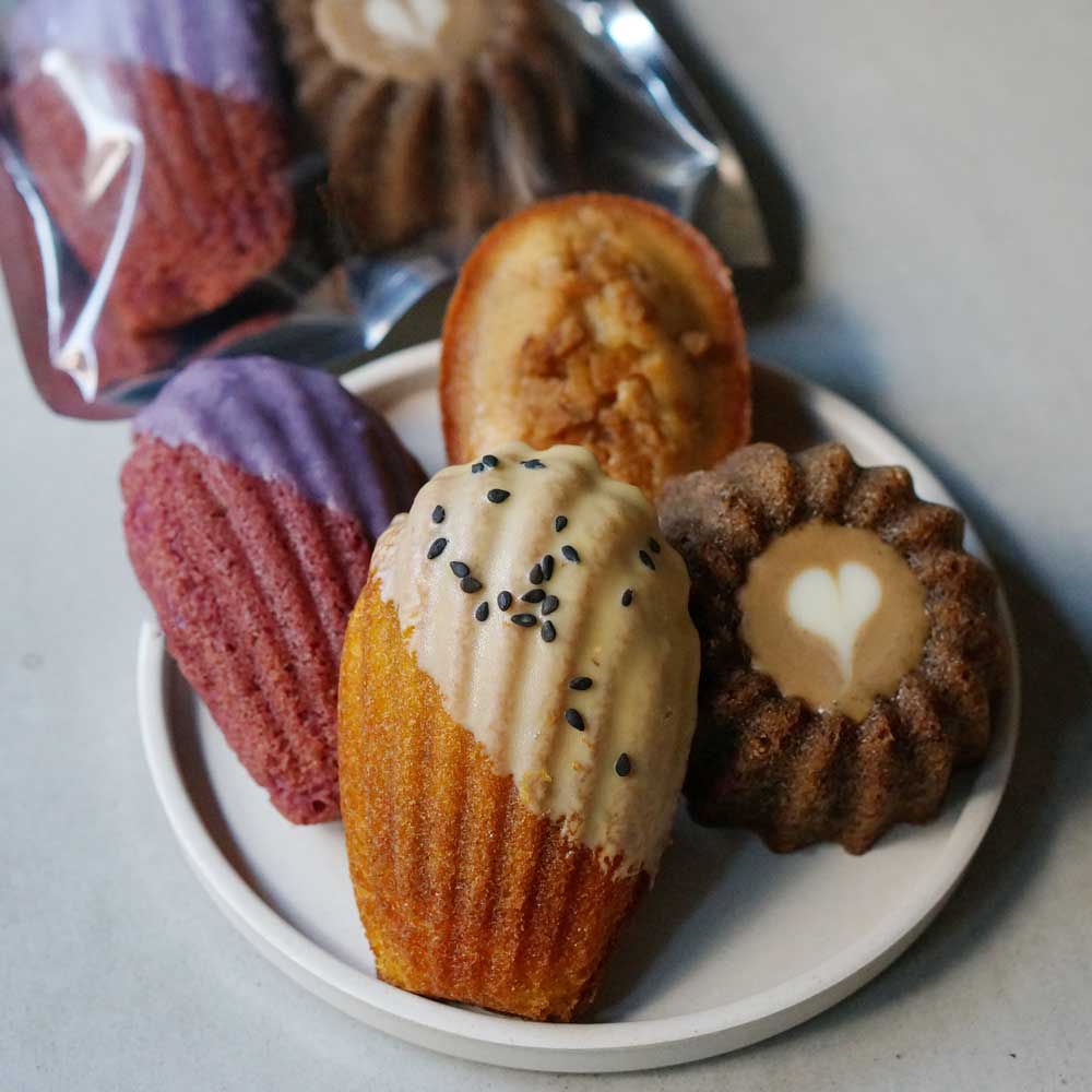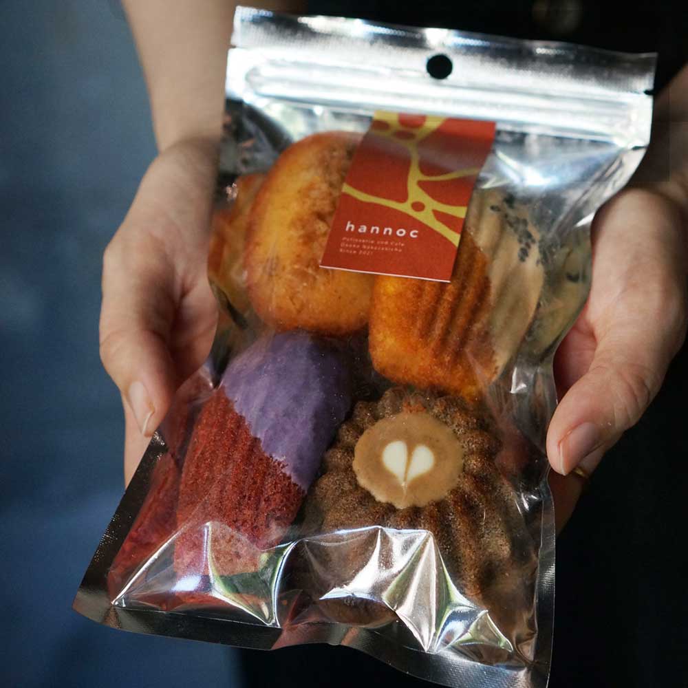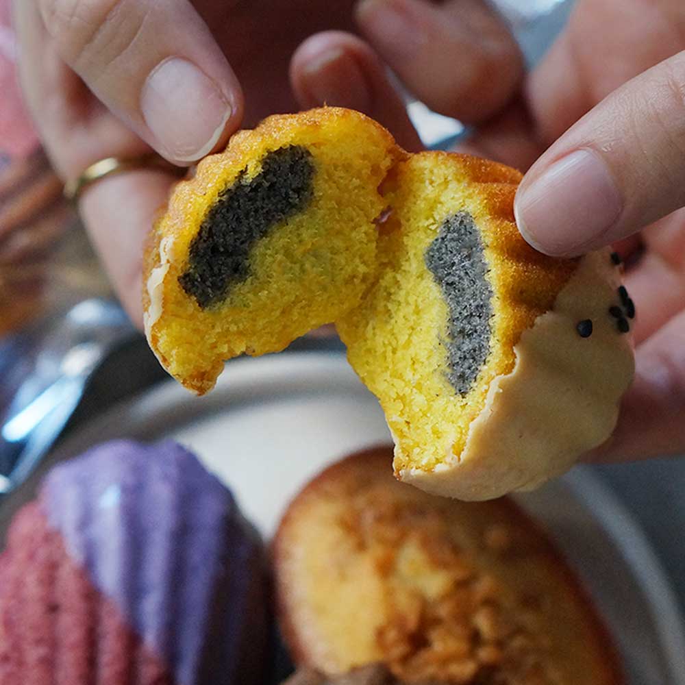 紫芋パウダーをふんだんに使用した生地と濃厚なキャラメル生地を、2層になるよう丁寧に焼き上げた、秋色のマドレーヌです。たくさんのお客様よりリクエストをいただく、秋限定の人気商品です。
